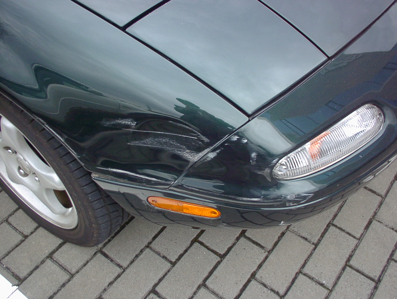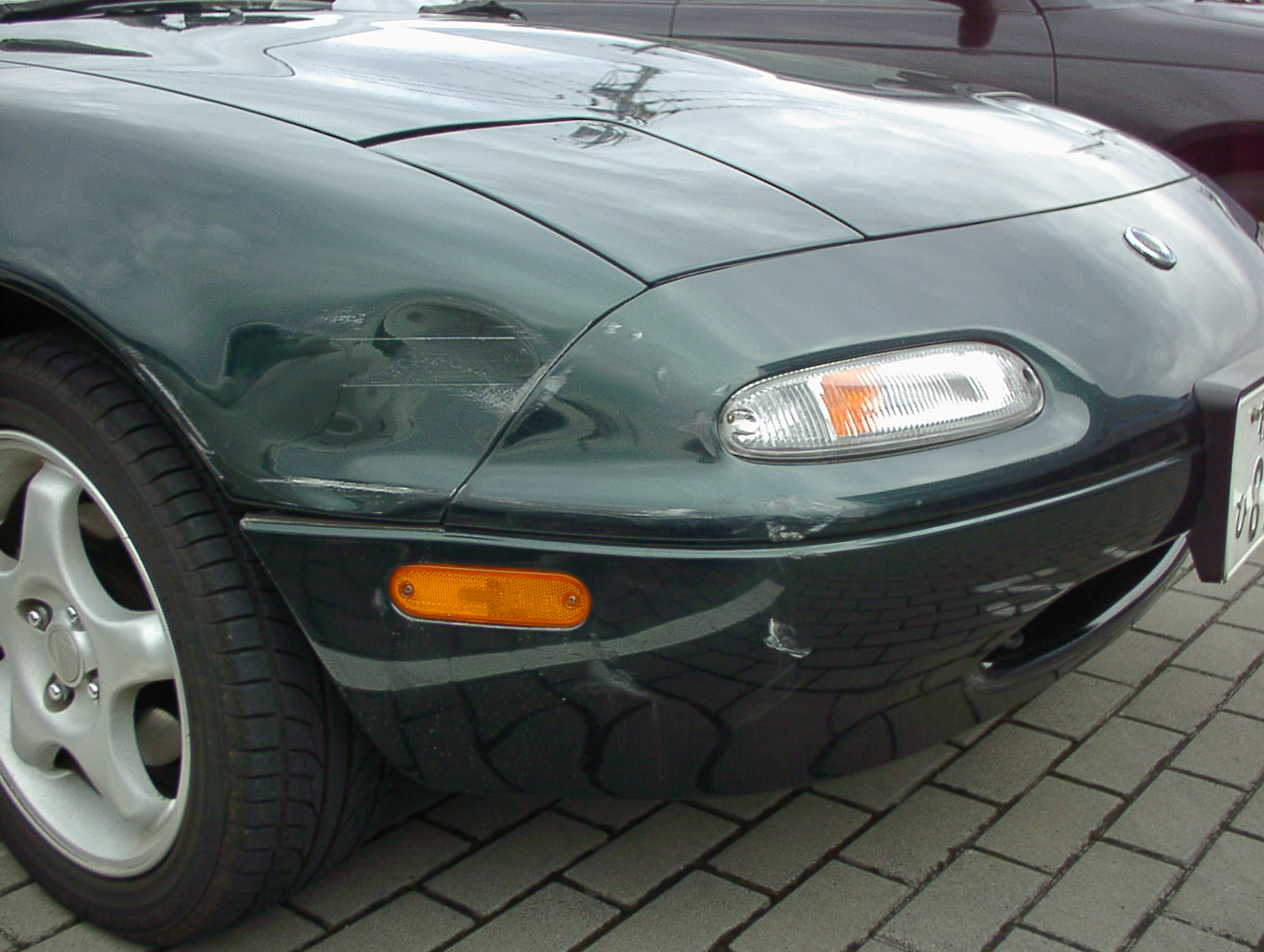 2000.4.6 いつものように出勤して仕事をしていると、会社の先輩に「す〜ぎ〜?車どうしたの?」と言われて、「は?」と聞き返すと「右の前が白くなってヘコンでんじゃん」。ダッシュして見に行くと、確かにヘコンでいます。会社の駐車場では私の車の右は植え込みなので、会社でぶつけられたはずがありません。