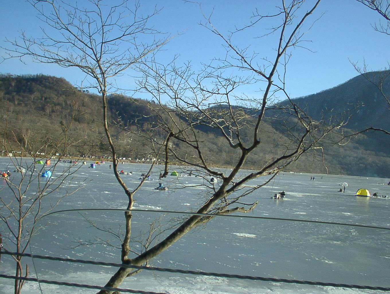 大沼が結氷していて、色とりどりのテントが並んでいました。私も車を止めてちょっと外に出ましたが、靴底が普通の地面にあっと言う間に凍り付く感覚。歩くとべたべたします。