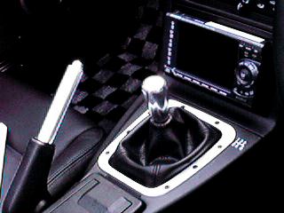 シフトノブとパーキングブレーキレバーはアルミ(私としてはこちらも革の方が良かった)です。右下にちょっと写っているのは、本来灰皿が入るところなんですが、私は車では煙草を吸わないので、小物入れにしています。